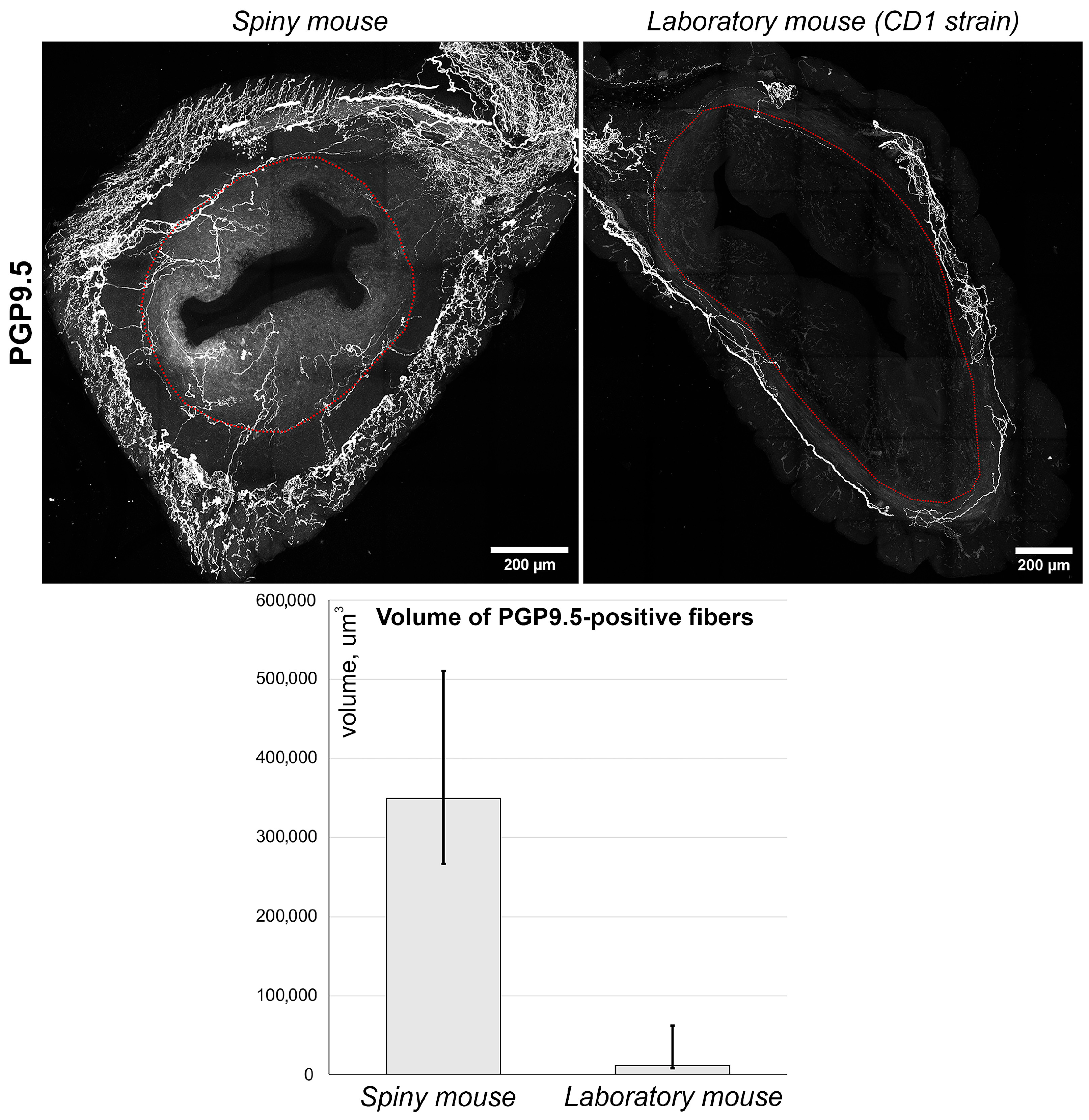 Another trait of spiny mice was higher density of nerve fibers compared to CD1 mouse strain, which should be taken into account when using them for experimental studies. Generally, the role of nerve fibers in the regulation of endometrial function has been poorly studied. It is only known that one of the possible diagnostic tests for minimal to mild endometriosis is the evaluation of nerve density in the eutopic endometrium [