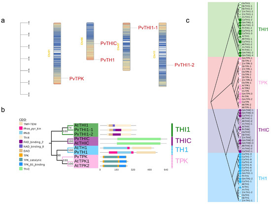 Chromosome, conserved domain and phylogenetic tree of the thiamine genes in common bean and Arabidopsis. (a) Distribution of thiamine genes in common bean chromosome. (b) The conservative domain of common beans. (c) Phylogenetic tree of the thiamine protein sequence in common bean and other species constructed by the maximum likelihood (ML) method.