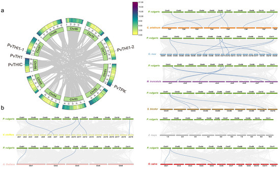 Syntenic analysis of thiamine-related genes in common bean and other plant species. (a) Intraspecies synteny of thiamine genes within the common bean genome. (b) Comparative synteny of thiamine genes between common bean and eight other species: soybean, chickpea, alfalfa, Arabidopsis, grape, rice, sorghum, and maize. Gray lines represent general collinear regions among genomes, while blue lines highlight syntenic thiamine gene pairs.