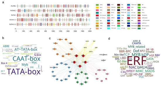 Cis-element and transcription factor (TF) analysis of thiamine biosynthesis gene promoters. (a) Distribution of cis-regulatory elements in the promoter regions of five thiamine biosynthesis genes. (b) Word cloud illustrating cis-elements, where larger font size indicates higher frequency. (c) Predicted TF regulatory network associated with thiamine biosynthesis. Diamonds represent TFs, while circles denote thiamine biosynthesis genes. Circle colors correspond to TF functional categories: blue (growth and development), green (stress response), pink (hormone signaling), yellow (metabolic regulation), orange (cell cycle and proliferation), gray (specialized functions), and orange (unspecified). (d) Word cloud of TFs, with font size proportional to the number of associated genes.
