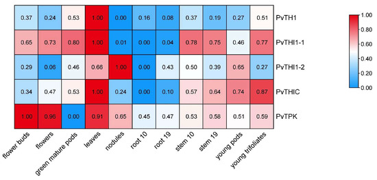To explore the spatial expression patterns of thiamine biosynthesis-related genes in common bean, we analyzed transcriptome data across 11 different tissues, including flower buds, green mature pods, flowers, leaves, nodules, roots (10 and 19 days), stems, and young trifoliates. PvTHI1-1 exhibited the highest expression in floral organs, early-stage pods, and leaves, indicating its possible involvement in reproductive development and photosynthetic tissues (Figure 4). PvTHI1-2 showed a more tissue-specific pattern, with predominant expression in nodules, suggesting a potential role in nodule function or nitrogen fixation. PvTHIC was moderately expressed in multiple tissues, particularly enriched in stems and early pod development stages, implying its participation in both vegetative and reproductive growth. In contrast, both PvTHI1 and PvTPK displayed generally low expression levels across all tissues, with no strong tissue-specific preference. Nonetheless, their expression was still detectable in most organs, including roots, indicating basal transcriptional activity under normal physiological conditions.
