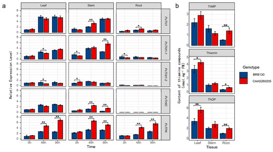 Differential expression of thiamine biosynthesis genes and endogenous thiamine compound content in resistant (CAAS260205) and susceptible (BRB130) genotypes following Fusarium wilt inoculation. (a) Relative expression levels of five thiamine biosynthesis-related genes (PvTHI1, PvTHI1-1, PvTHI1-2, PvTHIC, and PvTPK) in leaf, stem, and root tissues of BRB130 (blue) and CAAS260205 (red) at 0, 48, and 96 h post inoculation (hpi). (b) Quantification of three thiamine-related compounds—thiamine monophosphate (ThMP), thiamine (free form), and thiamine diphosphate (ThDP)—in leaf, stem, and root tissues of both genotypes. All gene expression levels were normalized and are shown as relative expression levels. Data represent mean ± SD (n = 3). Statistical differences between genotypes at the same time point or tissue were analyzed using a two-tailed Student’s t-test. Asterisks indicate significant differences (*, p < 0.05; **, p < 0.01).