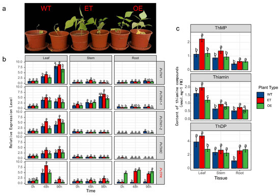 To further verify the role of thiamine in resistance to Fusarium wilt in common bean, exogenous application of thiamine and PvTPK overexpression via Agrobacterium rhizogenes-mediated transformation were applied to the susceptible genotype BRB130, followed by phenotypic, transcriptional, and metabolic analyses under inoculated conditions. Exogenous application of thiamine (ET) and overexpression of the PvTPK gene (OE) both significantly enhanced resistance to Fusarium wilt in common bean, as evidenced by improved growth and reduced disease symptoms compared to wild-type (WT) plants (Figure 6a). Gene expression analysis showed that all tissues of OE plants showed significant upregulation of PvTPK at all time points, with an expression of approximately 3.5–4.8 times that of wild type (Figure 6b). Additionally, the expression of upstream biosynthesis genes such as PvTHI1 and PvTHIC was significantly elevated in the leaves of OE plants at 96 h post inoculation (2.9 times and 3.3 times that of wild type, respectively), suggesting a positive feedback regulation. Exogenous thiamine treatment (ET) also led to moderate induction of several thiamine-related genes, particularly in leaf tissue, though generally lower than in OE plants. Metabolite profiling showed that ThMP and thiamine levels in leaves were significantly increased in ET plants, while ThDP content was significantly elevated in OE plants compared to WT (Figure 6c). These changes were most prominent in leaf tissue, aligning with the observed gene expression trends. Collectively, these results indicate that both exogenous thiamine supplementation and PvTPK overexpression can enhance resistance to Fusarium wilt in susceptible plants, potentially through promoting thiamine accumulation and activating biosynthetic gene expression.