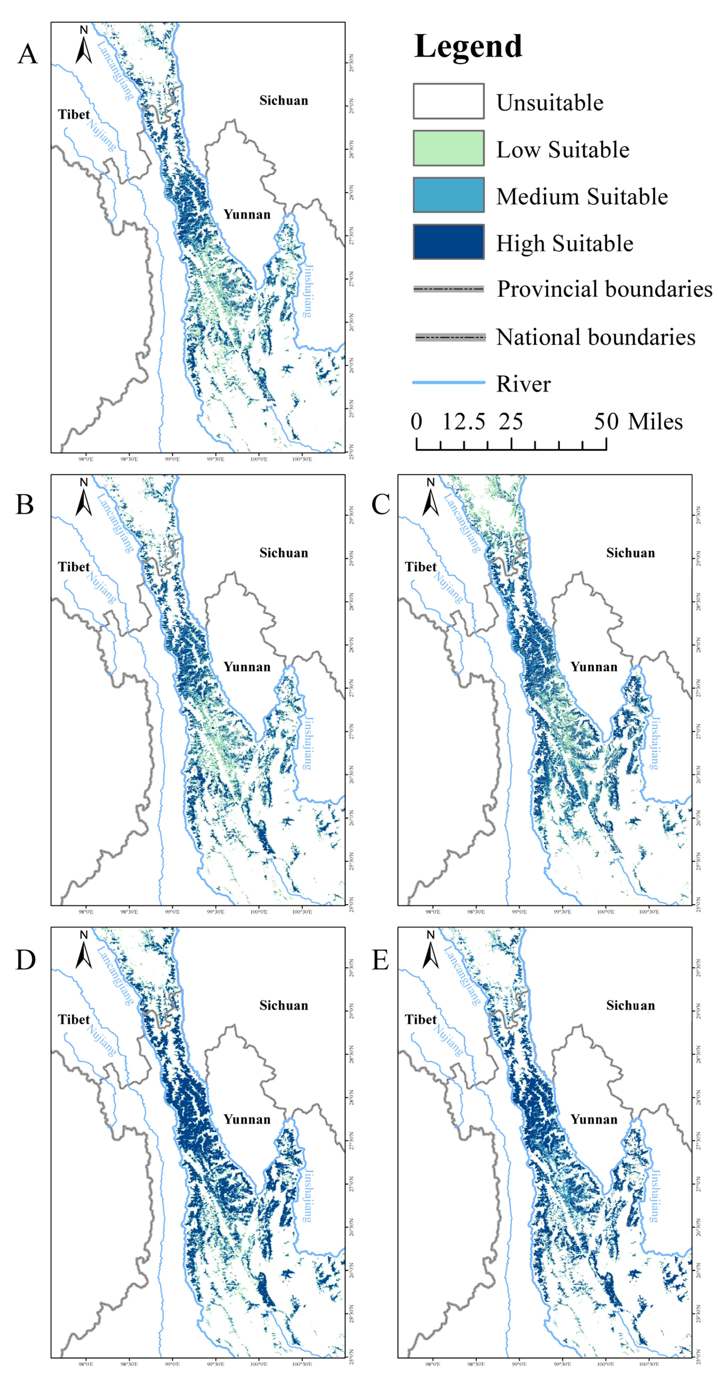 3.3. Potential Suitable Habitat of Lichen in Present and Future