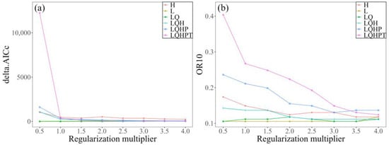 In this study, MaxEnt v.3.4.1 was employed to investigate the potential geographical distribution of L. ruthenicum in China. According to previous studies [,], the model’s performance was significantly affected by the configuration of two parameters, i.e., feature combinations (FCs) and regularization multiplier (RM) []. Therefore, it is crucial to optimize these two parameters. Considering the available feature types including Linear (L), Quadratic (Q), Product (P), Threshold (T) and Hinge (H), six FCs were employed (L, LQ, H, LQH, LQHP, and LQHPT). Additionally, eight RM values were set, with a range from 0.5 to 4.0 in steps of 0.5, leading to 48 parameter combinations. The optimal combination was then determined using the R package ENMeval based on the metrics such as the Akaike information criterion correction (AICc) and 10% training omission rate (OR10) [].