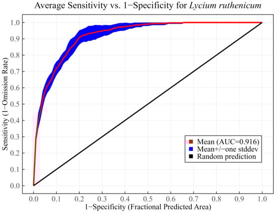The MaxEnt model repeated the calculation 10 times using the optimal parameters, and then the ROC curve was generated (Figure 3). In this study, the AUC was employed to assess predictive accuracy. The average training AUC was 0.946 ± 0.003, while the average testing AUC was 0.916 ± 0.011. These results suggested that the optimized model had excellent predictive accuracy in characterizing potential suitable habitats of L. ruthenicum.