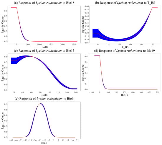 According to the correlation analysis combined with the contribution rate of various geographical and environmental factors, we identified Bio18, T_BS, Bio15, Bio19, and Bio6 as the top five factors affecting the distribution of L. ruthenicum. Among these, Bio18, Bio15, and Bio19 were precipitation-related factors, underscoring a certain role of precipitation in reflecting the geographical distribution of L. ruthenicum. This is largely because L. ruthenicum is predominantly found in the arid desert and saline–alkali regions of northwestern China, where precipitation is extremely scarce [,]. It should be noted that the response curves between precipitation-related variables and the probability of species presence are likely to reflect a statistical association rather than a biologically causative relationship []. In addition to precipitation, temperature is also an important determinant for many plant species [,]. A recent study found that the semi-lethal temperatures of L. ruthenicum range from −35 to −26 °C [], suggesting that it can thrive within the optimal range of −21.5 to −6 °C for Bio6.
