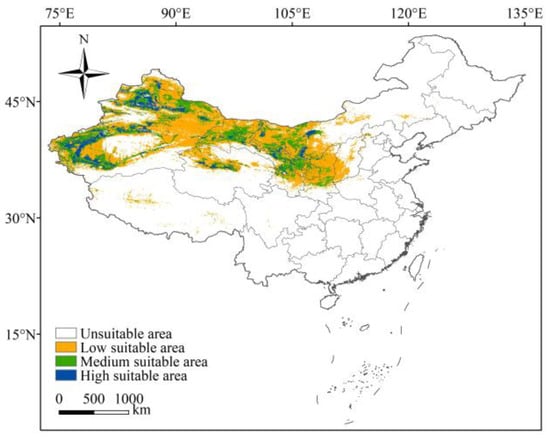 The potential habitat suitability of L. ruthenicum in China, under current conditions, were generated using the MaxEnt model, as shown in Figure 5. According to Figure 5, the potential suitable areas of L. ruthenicum were distributed in 11 provinces, predominantly in northwestern China. Approximately 0.25 × 106 km2 was identified as highly suitable, representing 11.11% of the total suitable area, and these areas were primarily distributed in Xinjiang, Qinghai, Gansu, Ningxia, and Inner Mongolia. Moderately suitable areas covered 0.56 × 106 km2, representing 24.89% of the total suitable area, and were typically adjacent to highly suitable areas. In contrast, the lowly suitable area was 1.44 × 106 km2, which constituted 64.0% of the total suitable area, and extended into regions such as Shaanxi, Shanxi, Hebei, Henan, Sichuan, and Tibet.