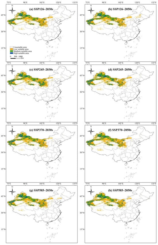 The potential suitable habitats of L. ruthenicum in China under future climate scenarios. (a) The potential geographical distribution of L. ruthenicum under the SSP126 in the 2030s. (b) The potential geographical distribution of L. ruthenicum under the SSP126 in the 2050s. (c) The potential geographical distribution of L. ruthenicum under the SSP245 in the 2030s. (d) The potential geographical distribution of L. ruthenicum under the SSP245 in the 2050s. (e) The potential geographical distribution of L. ruthenicum under the SSP370 in the 2030s. (f) The potential geographical distribution of L. ruthenicum under the SSP370 in the 2050s. (g) The potential geographical distribution of L. ruthenicum under the SSP585 in the 2030s. (h) The potential geographical distribution of L. ruthenicum under the SSP585 in the 2050s. Different colors in each figure represent different suitability classes, with the meanings of the colors shown in Figure 6a.
