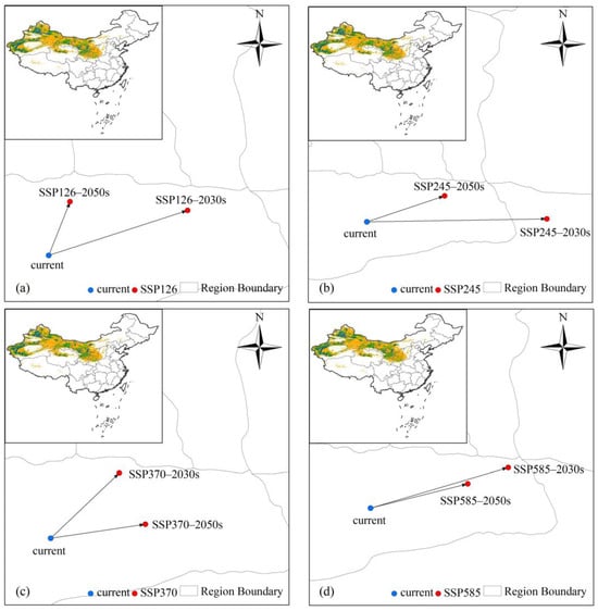 The centroid migration of L. ruthenicum under future climate scenarios. (a) The centroid migration in potential suitable areas of L. ruthenicum under the SSP126 in the 2030s and 2050s. (b) The centroid migration in potential suitable areas of L. ruthenicum under the SSP245 in the 2030s and 2050s. (c) The centroid migration in potential suitable areas of L. ruthenicum under the SSP370 in the 2030s and 2050s. (d) The centroid migration in potential suitable areas of L. ruthenicum under the SSP585 in the 2030s and 2050s. The inset in the upper left corner of each figure represents the potential suitable habitats of L. ruthenicum in China under the current conditions, which is derived from Figure 5.