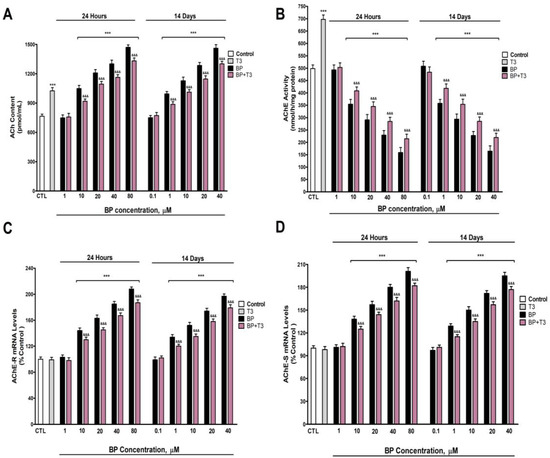 ACh levels in the supernatant of cell cultures were quantified following 1- and 14-days of exposure to BP at concentrations ranging from 0.1 µM to 80 µM. BP treatment induced a dose-dependent elevation in ACh levels compared to the control group, with statistically significant effects observed at concentrations ≥10 µM after 1 day and ≥1 µM after 14 days (Figure 2A). Treatment with T3 also significantly increased ACh levels. However, co-treatment with T3 and BP attenuated the BP-induced rise in ACh (Figure 2A).