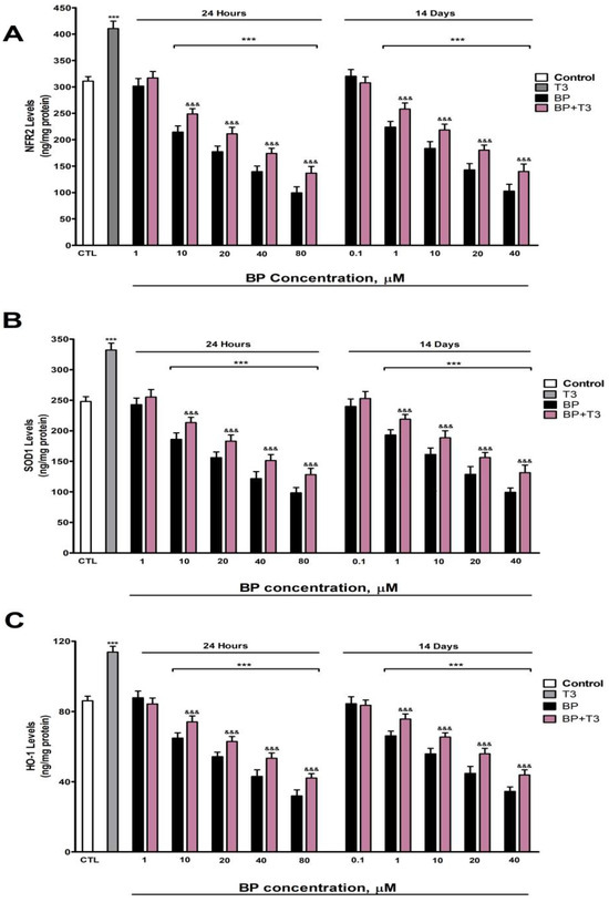 NRF2, SOD-1, and HO-1 protein levels (Figure 3A, Figure 3B, and Figure 3C, respectively) showed a dose-dependent reduction following both 1-day (threshold: ≥10 µM) and 14-day (threshold: ≥1 µM) BP treatment, with progressively greater effects observed at higher concentrations. T3 treatment significantly increased the SOD-1 (Figure 3B) and HO-1 (Figure 3C) protein content in SN56 cells. T3 co-treatment with BP partially lessened the reduction in NRF2 (Figure 3A), SOD-1 (Figure 3B), and HO-1 (Figure 3C) protein content observed after BP treatment alone (Figure 3).