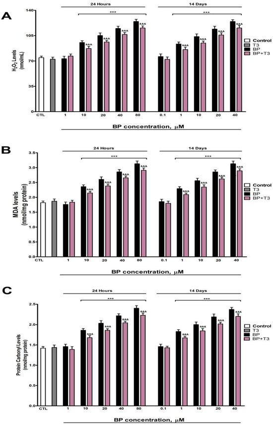 Levels of H2O2, MDA, and protein carbonyls (Figure 4A, Figure 4B, and Figure 4C, respectively) exhibited a dose-dependent elevation following BP treatment, with significant increases observed at concentrations ≥10 µM after 1 day and ≥1 µM after 14 days. T3 treatment has not affected the H2O2 (Figure 4A), MDA (Figure 4B), and protein carbonyls (Figure 4C) content in SN56 cells. T3 co-treatment with BP partially lessened the increase of H2O2 (Figure 4A), MDA (Figure 4B), and protein carbonyl (Figure 4C) levels observed following BP exposure (Figure 4).