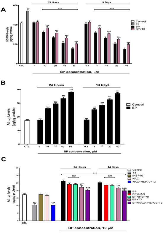 BP (0.1–80 µM) effects on (A) HSP70 and (B) Aβ1-42 protein content after one- and fourteen-days of treatment. Effects of treatment with BP (10 µM), NAC (1 mM), T3 (15 nM) or rHSP70 (30 µM), simultaneous NAC, T3, and rHSP70, or BP co-treatment with or without NAC, with or without T3, and with or without rHSP70 on Aβ1-42 protein content (C). Data represent the mean ± SEM of three separate experiments from cells of different cultures, each one performed in triplicate. *** p < 0.001 compared to control. ### p ≤ 0.001 compared to BP treatment. γγγ p ≤ 0.001 compared to rHSP70 co-treated cells with BP. &&& p ≤ 0.001 compared to T3 co-treated cells with BP.