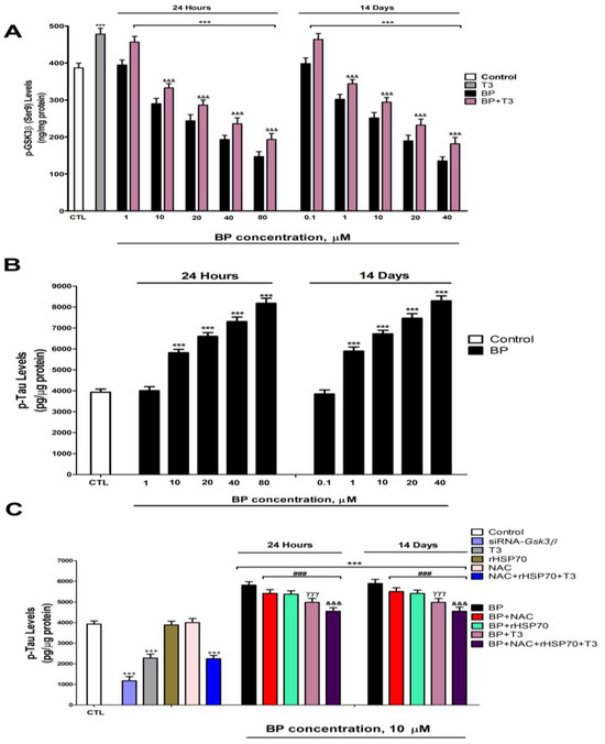 BP (0.1–80 µM) effects on (A) p-GSK3β (Ser9) and (B) p-Tau protein content after one- and fourteen-days of treatment. Effects of Gsk3β knockdown, treatment with BP (10 µM), NAC (1 mM), T3 (15 nM) or rHSP70 (30 µM), simultaneous NAC, T3, and rHSP70, or BP co-treatment with or without NAC, with or without T3, and with or without rHSP70 on p-Tau protein content (C). Data represent the mean ± SEM of three separate experiments from cells of different cultures, each one performed in triplicate. *** p < 0.001 compared to control. ### p ≤ 0.001 compared to BP treatment. γγγ p ≤ 0.001 compared to rHSP70 co-treated cells with BP. &&& p ≤ 0.001 compared to T3 co-treated cells with BP.