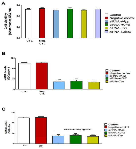 Transfection of SN56 cells with individual siRNAs targeting AChE, βApp, Gsk3β, or Tau or combined siRNAs for AChE/βApp/Tau showed no effect on cell viability compared to control siRNA (Figure 7A and Figure 8B). Control siRNA transfection did not alter the expression of AChE, Gsk3β, βApp, or Tau genes (Figure 7B,C). In contrast, targeted knockdown with single siRNAs significantly reduced the expression of their respective target genes, as did the combined AChE/βApp/Tau siRNA treatment (Figure 7B,C).