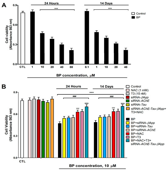 BP (0.1–80 µM) effects on SN56 cells viability (A). BP (10 µM) effect on wild-type or on single/simultaneous βApp, Tau, and AChE-silenced cells co-treated with or without T3 (15 nM) and/or NAC (1 mM) (B). Cell viability was determined by MTT test. Data represents the mean ± SEM of three separate experiments from cells of different cultures, each one performed in triplicate. *** p < 0.001 compared to control. ### p ≤ 0.001 compared to BP treatment. γγγ p ≤ 0.001 compared to AChE-silenced cells treated with BP. &&& p ≤ 0.001 compared to T3 co-treated cells with BP.
