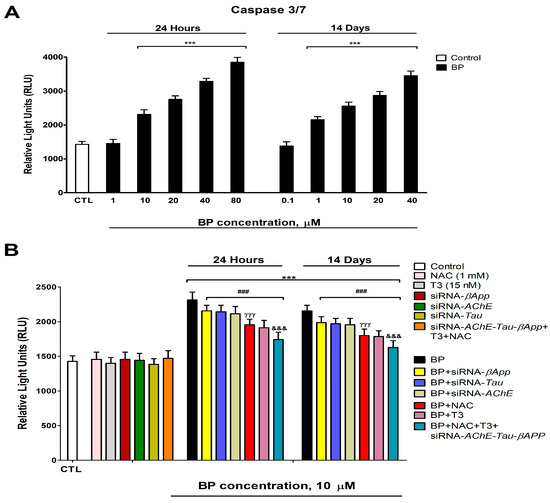 Analysis of caspases 3/7 activity after BP (0.1–80 µM) treatment in SN56 cells (A). Analysis of caspases 3/7 activity in BP (10 µM) wild-type or βApp, Tau, and AChE-silenced cells co-treated with or without T3 (15 nM) and/or NAC (1 mM) (B). Values are expressed as mean ± SEM of three separate experiments from cells of different cultures, each one performed in triplicate. *** p < 0.001 compared to control. ### p ≤ 0.001 compared to BP treatment. γγγ p ≤ 0.001 compared to AChE-silenced cells treated with BP. &&& p ≤ 0.001 compared to T3 co-treated cells with BP.