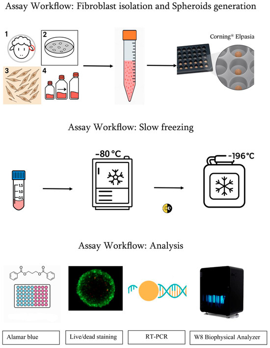 Overview of the experimental workflow, from ovine fibroblast isolation and monolayer expansion to 3D spheroid formation and cryopreservation via slow freezing. Post-thaw, assays were used to evaluate metabolic activity (Alamar Blue), cell viability (Live/Dead), gene expression (RT-PCR), and biophysical properties (W8 Biophysical Analyzer).