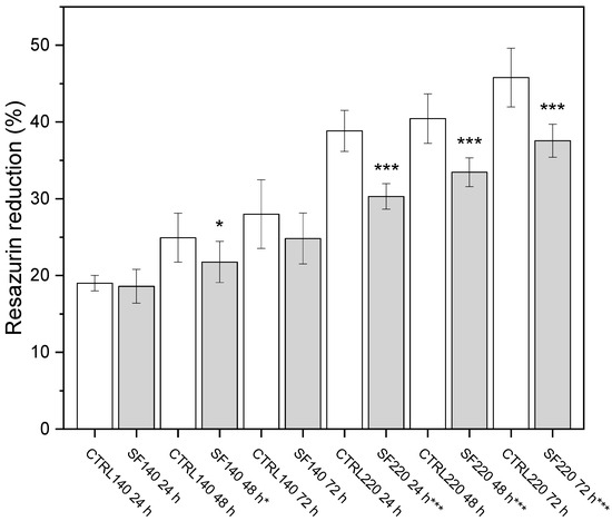 Metabolic activity after thawing. Alamar Blue reduction (mean ± SD, n = 3) for control (CTRL, white bars) and cryopreserved (SF, gray bars) spheroids at 24, 48 and 72 h. p-values < * 0.05; p-values < *** 0.001.