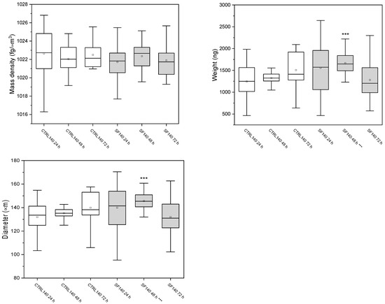 Box plot representation of mass density, weight and diameter of control (CTRL, white bars) and slow-frozen (SF, gray bars) spheroids of 140 µm measured at 24, 48 and 72 h. The line inside each box indicates the median; the lower and upper box boundaries correspond to the first and third quartiles (Q1 and Q3); the whiskers extend to 1.5 × IQR. In 140 µm spheroids, values remained comparable to CTRL, with a transient significant increase in weight and diameter observed at 48 h (p < 0.05). Please note that data were analyzed to verify the Gaussian distribution, for this reason the outliers (K > 1.5) were deleted. Student’s t-test (two-tailed and heteroscedastic) was used to assess statistical significance between the 6 conditions under testing. p-values < *** 0.001.