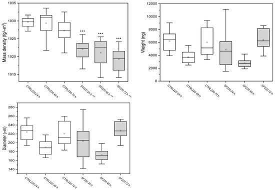 Box plot representation of mass density, weight and diameter of control (CTRL, white bars) and slow-frozen (SF, gray bars) spheroids of 220 µm measured at 24, 48 and 72 h. The line inside each box indicates the median; the lower and upper box boundaries correspond to the first and third quartiles (Q1 and Q3); the whiskers extend to 1.5 × IQR. All parameters are significantly reduced at every time point (*** p < 0.001). Data means SD (n = 30 per group). Please note that data were analyzed to verify the Gaussian distribution, for this reason the outliers (K > 1.5) are deleted. Student’s t-test (two-tailed and heteroscedastic) was used to assess statistical significance between the 6 conditions under testing. p-values < *** 0.001.