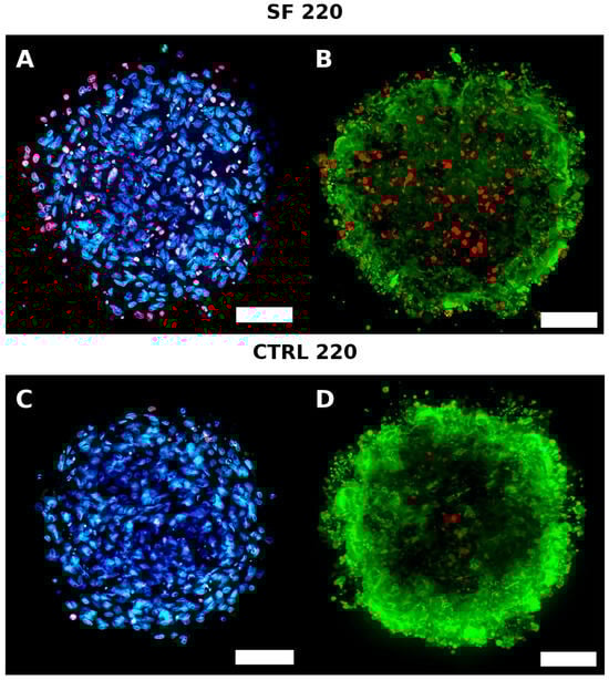 The viability of spheroids was also assessed 24 h after thawing using calcein-AM, propidium iodide (PI), and Hoechst. Briefly, 10 spheroids from three groups (cryopreserved and control) were incubated with 1 µL of calcein-AM (10 µg/µL; Invitrogen, Waltham, MA, USA), 1 µL of PI (10 µg/µL; Sigma-Aldrich, St. Louis, MO, USA), and 1 µL of Hoechst (10 µg/µL; Thermo Fisher Scientific) for 30 min at 37 °C with 5% CO2. After incubation, spheroids were transferred onto a microscope slide and viewed under a fluorescence microscope (Leica CTR 6000, Leica Microsystems, Wetzlar, Germany).