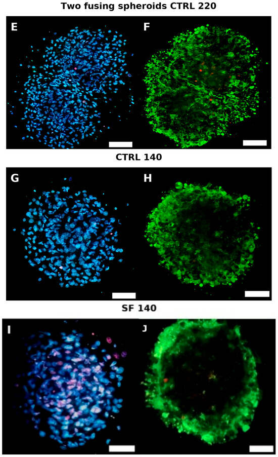 - Replicates: For each experimental condition, three independent biological replicates were included, with multiple spheroids analyzed per replicate as specified in the Materials and Methods subsections.