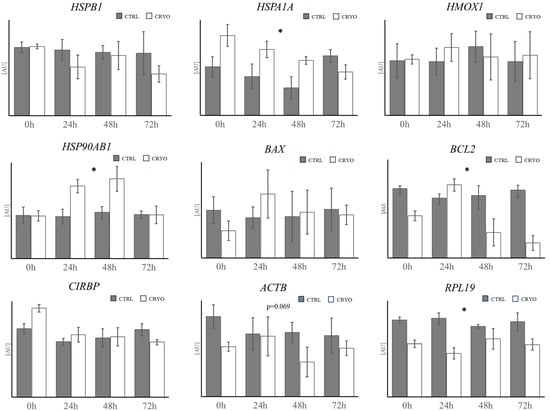 Relative expression of HSPB1 (HSP27), HSPA1A (HSP70), HMOX1 (HSP32), HSP90AB1, BAX, BCL2, CIRBP, ACTB and RPL19 in spheroids of 220 µm diameter at 0 h, 24 h, 48 h or 72 h of in vitro culture post-cryopreservation (white column; CRYO) and control spheroids not subjected to cryopreservation (gray column; CTRL) at the same time points. Transcript abundance of target genes was performed after normalization against expression of two reference genes (YWHAZ and SDHA) and expressed in arbitrary units [AU]. Each column represents the mean value ± SEM of 4 samples (ANOVA General Linear Model * = p < 0.05).