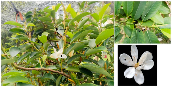 The Michelia ‘Xin’ individuals (Figure 1) used for the present investigations are cultivated on the campus of Central South University of Forestry and Technology, Changsha, China (North latitude, between 27°51′ and 28°40′; East longitude, between 111°54′ and 114°15′). The school belongs to a typical subtropical humid climate. The average annual precipitation of 1361.6 mm is concentrated between April and July. The annual relative humidity is 80%, and the annual average temperature is 17.4 °C.