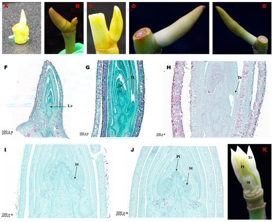 Morphological characteristics of the flower bud differentiation process in Michelia ‘Xin’. (A,F) Vegetative stage (T1). (B,G) Floral meristem transition stage (T2). (C,H) Tepal primordia differentiation stage (T3). (D,I) Stamen primordia differentiation stage (T4). (E,J) Pistil primordium differentiation stage (T5). (K) The fully developed flower bud. Le: leaf; Fl: Flower primordium; Te: Tetal primordium; St: Stamen primordium; Pi: Pistil base.