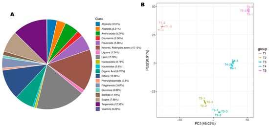 Metabolite profiles of developing floral buds at five different stages. (A) Classification of all identified metabolites. (B) Principal component analysis. T1, T2, T3, T4, and T5 indicate the vegetative stage, floral meristem transition stage, tepal primordia differentiation stage, stamen primordia differentiation stage, and pistil primordia differentiation stage, respectively.