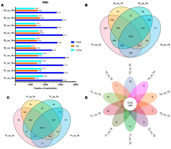 DMs offer the opportunity to identify differentially regulated pathways (DPs). We conducted an OPLS-DA analysis to identify DMs. The score plots of OPLS-DA supported the high difference in the metabolite profiles of flower buds of different stages (Figure S3). The OPLS-DA models showed strong goodness of fit and reliability, with an R2Y and Q2Y of 1 and ˃ 0.985, respectively (Figure S3A–D). We uncovered a total of 2432 to 3304 DMs in pairwise comparison between groups (Figure 4A). Notably, we detected 3122 (including 1287 up-regulated), 2432 (including 1391 up-regulated), 2760 (including 1413 up-regulated), and 2742 (including 1483 up-regulated) between T1_vs_T2, T2_vs_T3, T3_vs_T4, T4_vs_T5, respectively (Figure 4A and Figure S4A–D). Of them 1184 DMs were common to T1_vs_T2, T2_vs_T3, T3_vs_T4, T4_vs_T5(Figure 4B. When we considered T1 as the control group, we identified 2210 overlapped DMs (Figure 4C). The Petal diagram among DMs between all pairwise comparisons revealed a total of 584 core DMs (Figure 4D). The 584 core DMs are listed in Table S2.