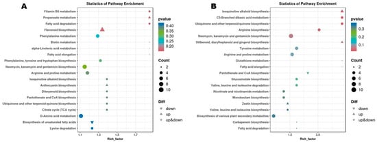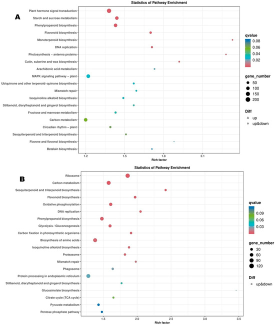 KEGG annotation and enrichment analysis of DMs between T1_Vs_T2 (A) and T2_Vs_T3 (B). T1, T2, and T3 indicate the vegetative stage, floral meristem transition stage, and tepal primordia differentiation stage, respectively.