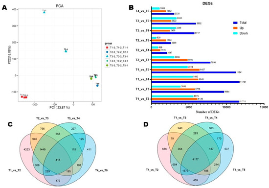 Transcriptome profiles of developing floral buds at five different stages. (A) Principal component analysis. (B) Number of DEGs (differentially expressed genes) in all pairwise comparisons. (C) Venn diagram of common DMs between T1_vs_T2, T2_vs_T3, T3_vs_T4, T4_vs_T5. (D) Venn diagram of overlapped DMs between T1_vs_T2, T1_vs_T3, T1_vs_T4, T1_vs_T5. T1, T2, T3, T4, and T5 indicate the vegetative stage, floral meristem transition stage, tepal primordia differentiation stage, stamen primordia differentiation stage, and pistil primordia differentiation stage, respectively.