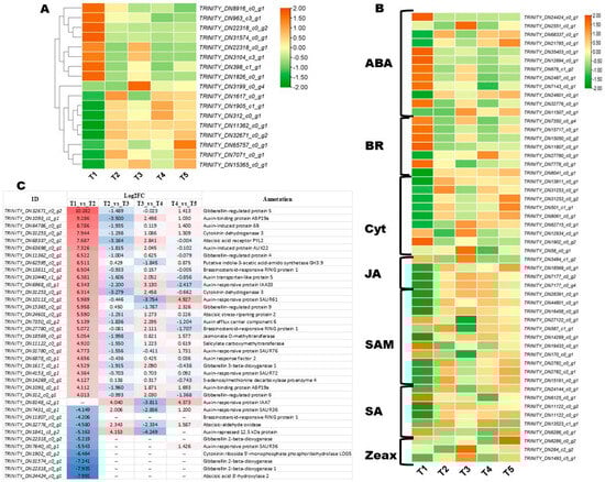 Differentially expressed phytohormone-related DEGs. (A) Expression patterns of gibberellin-related DEGs. (B) Expression patterns of other phytohormone-related DEGs, except auxin. (C) Expression fold changes of most differentially expressed phytohormone-related DEGs. The redder the color, the higher the fold changes, conversely to the blue color. T1, T2, T3, T4, and T5 indicate the vegetative stage, floral meristem transition stage, tepal primordia differentiation stage, stamen primordia differentiation stage, and pistil primordia differentiation stage, respectively.
