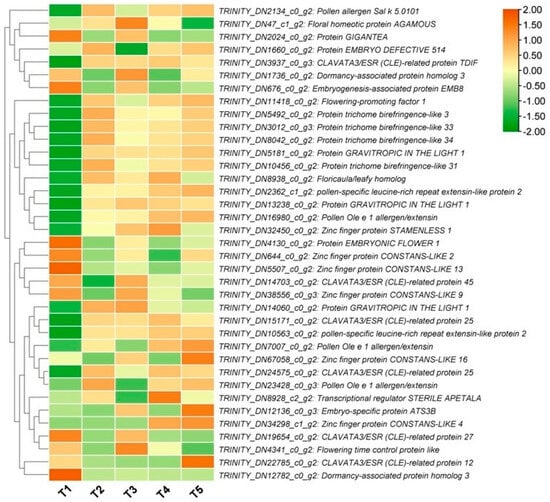 The transition from vegetative growth to reproductive development is mediated by the photoperiodic response to sensing the length of night/day through circadian regulation of light-signaling molecules [46,47]. Therefore, to better understand the FBD process in Michelia ‘Xin’, we screened out differentially expressed circadian and flowering-related DEGs. In total, 37 genes were identified (Table S6), and their expression patterns are shown in Figure 9. Most of them showed high expression from T2 (floral meristem transition period) to T5 (pistil primordia differentiation stage) compared to T1 (vegetative period) (Figure 9). Four protein trichome birefringence-like genes (TRINITY_DN5492_c0_g1, TRINITY_DN10456_c0_g1, TRINITY_DN3012_c0_g2, and TRINITY_DN8042_c0_g1) were up-regulated more than 5.6-fold during the floral meristem transition period (T2) (Table S6). Floricaula/leafy homolog (TRINITY_DN8938_c0_g1) and flowering-promoting factor 1 (TRINITY_DN11418_c0_g1) were also up-regulated during the floral meristem transition period (T2) by 4.302-fold and 11.729-fold, respectively (Table S6). Transcriptional regulator STERILE APETALA (TRINITY_DN8928_c2_g1) and CLAVATA3/ESR (CLE)-related protein 12 (TRINITY_DN22785_c0_g1) were up-regulated over 5.2-fold at T4 (stamen primordia differentiation stage) and T5 (pistil primordia differentiation stage), respectively (Table S6). Two dormancy-associated protein homolog 3 genes (TRINITY_DN12782_c0_g1 and TRINITY_DN1736_c0_g1), one protein EMBRYONIC FLOWER 1 gene (TRINITY_DN4130_c0_g1), and three Zinc finger protein CONSTANS-LIKE genes (TRINITY_DN5507_c0_g1, TRINITY_DN644_c0_g1, and TRINITY_DN38556_c0_g2) were significantly down-regulated during the transition from T1 (vegetative period) to T2 (floral meristem transition period) (Figure 9, Table S6). Meanwhile, one Zinc finger protein STAMENLESS 1 gene (TRINITY_DN32450_c0_g1) and three protein GRAVITROPIC IN THE LIGHT 1 genes (TRINITY_DN14060_c0_g1, TRINITY_DN13238_c0_g1, and TRINITY_DN5181_c0_g1) were up-regulated over 2.4-fold during the transition from T1 to T2 (Figure 9, Table S6).
