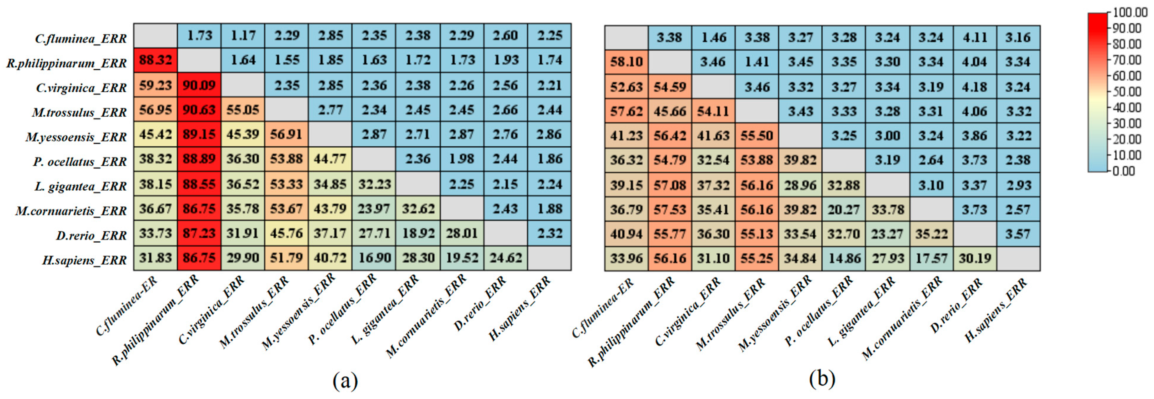 4.1. The Evolutionary Analysis of ERRs in Bivalve Mollusks