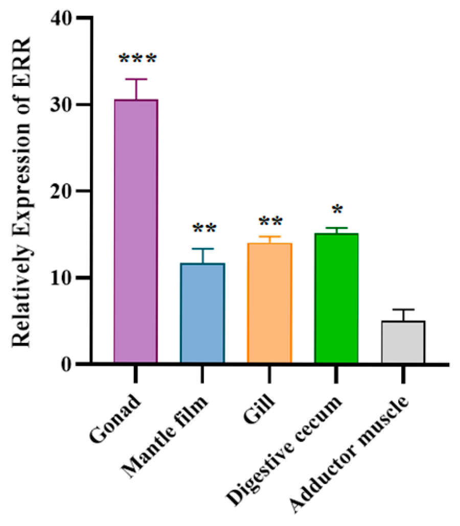 4.2. The Tissue-Specific Expression Analysis of ERRs in Bivalve Mollusks