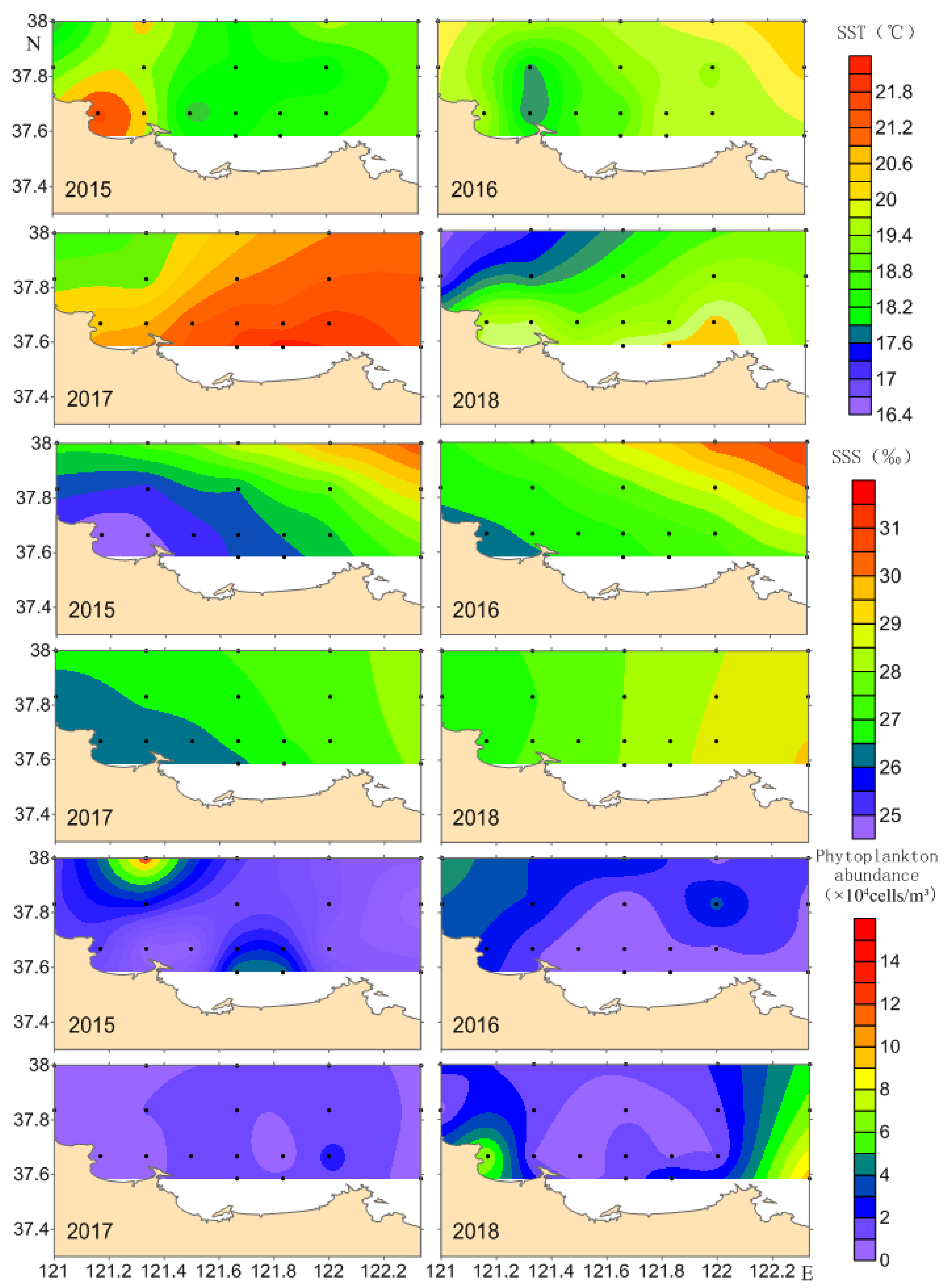 - Jiang, H.C.; Liu, N.; Gao, J.Q.; Su, B.; Li, J.H.; He, J.L.; Liu, A.Y. Zooplankton community structure in Sishili Bay and its relationship with environmental factors. Acta Ecol. Sin. 2017, 37, 1318–1327. [Google Scholar] [CrossRef]