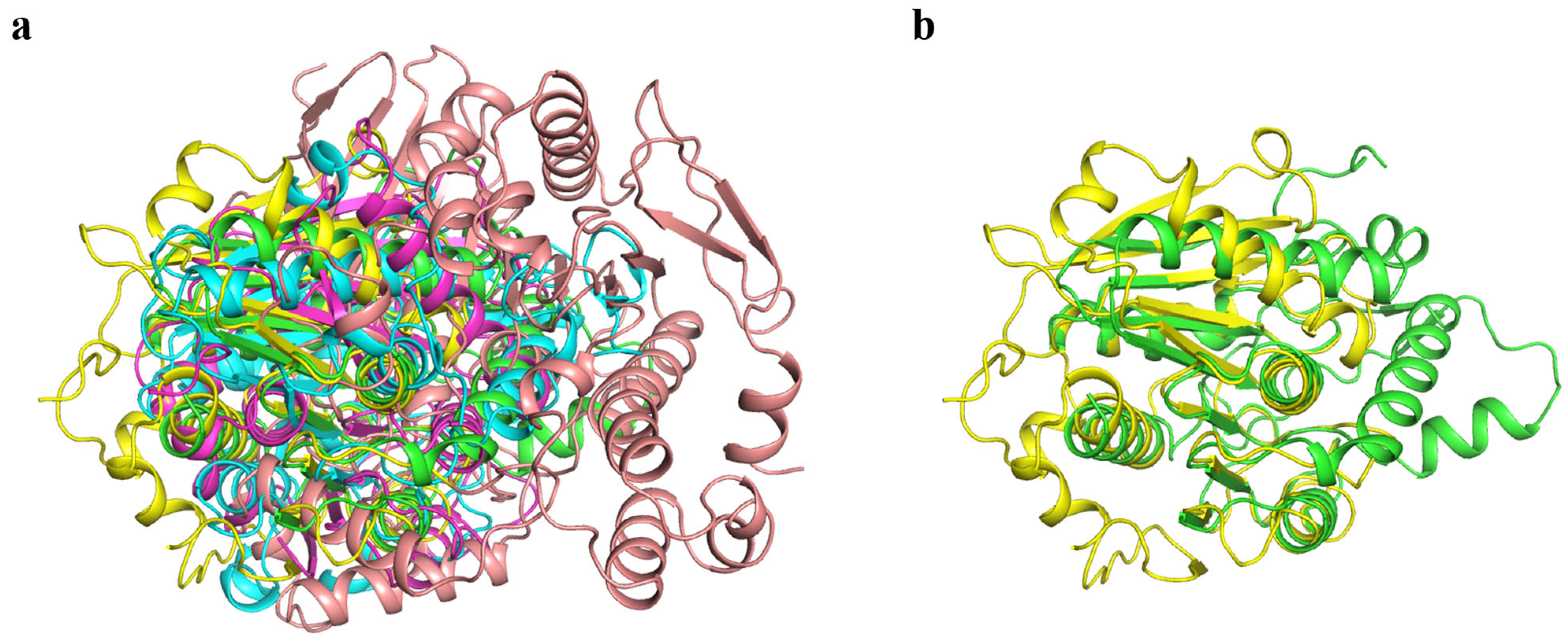 3.6. Comparison of the Structure of Gs and Other BHET Hydrolases