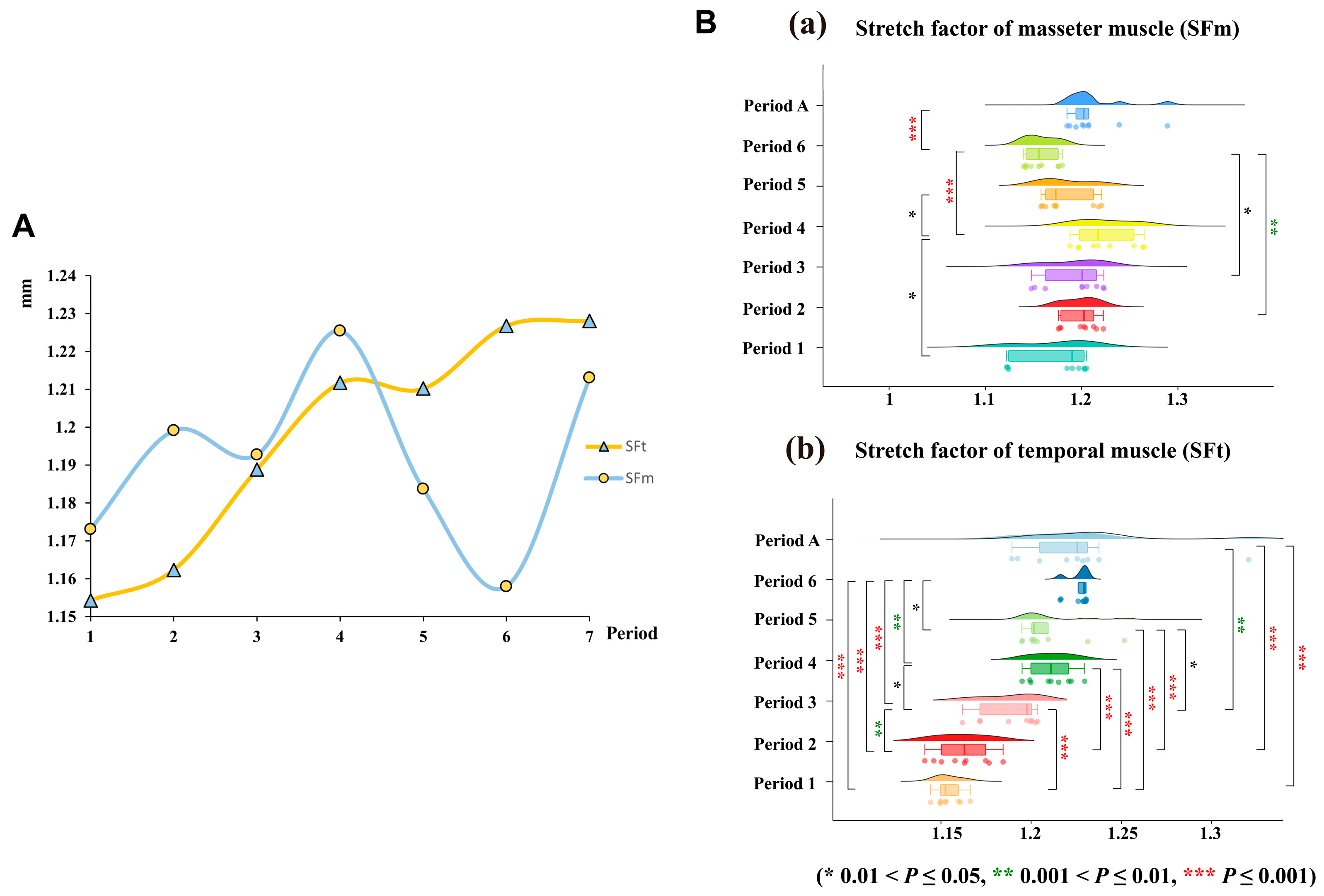 2.5. Comparison of Stretch Factors of V. sinensis Masticatory Muscles at Different Developmental Periods