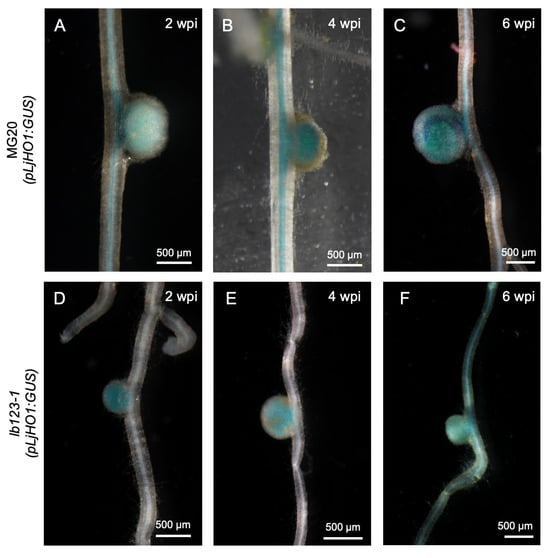 Spatiotemporal expression pattern of LjHO1 in the lb123-1 mutant background. Histochemical analysis of pLjHO1:LjHO1-GUS activity in nodules of WT MG20 (A–C) and the lb123-1 mutant (D–F) at 2, 4, and 6 weeks post-inoculation (wpi) with Mesorhizobium loti MAFF303099. Representative images are shown from at least eight independent hairy root transformation events. Scale bar, 500 μm.