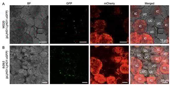 Subcellular localization of LjHO1 in MG20 and lb123 mutant nodules. Transgenic hairy roots expressing pLjHO1:LjHO1-sGFP in MG20 (A) and lb123-1 (B) were inoculated with M. loti MAFF303099 constitutively expressing mCherry. Nodule sections were examined at 4 weeks post-inoculation (wpi) by confocal microscopy. Merged images show GFP fluorescence, rhizobia (mCherry), and bright-field (BF) signals. Representative images are shown from at least six independent hairy root transformation events. IC, infected cell; UC, uninfected cell. Scale bars, 15 μm and 20 μm in (A) and (B), respectively.