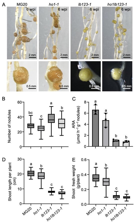 Symbiotic phenotypes of the ho1lb123 quadruple mutant. (A) Representative nodules of MG20, ho1-1, lb123-1, and ho1lb123-1 at 6 weeks post inoculation (wpi) with M.loti MAFF303099. Scale bar, 2 mm and 0.5 mm in the upper and lower panels, respectively. (B) Nodule number. Data are presented as mean ± SD (n ≥ 32). (C) Acetylene reduction activity (ARA). Data are shown as mean ± SD from three biological replicates, each consisting of nodules collected from 6 to 8 plants. (D) Shoot length. Data are presented as mean ± SD (n ≥ 30). (E) Shoot fresh weight. Data are presented as mean ± SD (n ≥ 30). For panels (B–D), statistical significance was determined using one-way ANOVA with multiple comparisons. Means labelled with the same letter are not significantly different at p < 0.05.