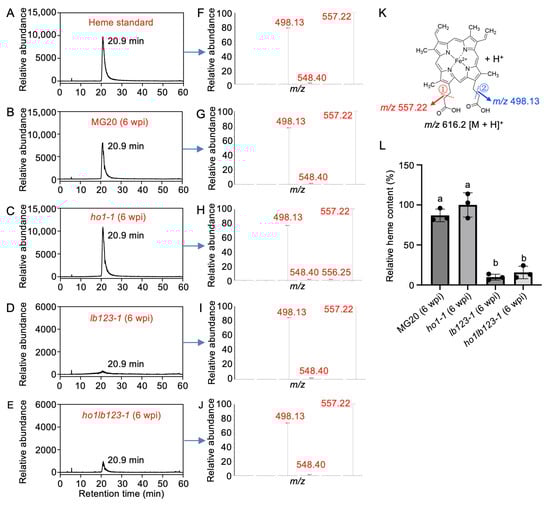 Quantification of heme content in the ho1lb123 quadruple mutant. (A–J) UPLC chromatograms of the heme standard (A) and nodule extracts from MG20, ho1-1, lb123-1, and ho1lb123-1 mutants at 6 wpi (B–E), along with the corresponding MS/MS spectra (F–J). The retention time of heme was 20.9 min. (K) Fragmentation pattern of heme showing the generation of ions at m/z 557.22 and m/z 498.13 in (F–J); ① and ② indicate the sequential cleavage sites of chemical bonds. (L) Quantitative analysis of heme levels in nodules from MG20, ho1-1, lb123-1, and ho1lb123-1 at 6 wpi using UPLC/ESI-MS/MS. Data represent means ± SD of three biological replicates, each replicate consisting of nodules pooled from six plants. Statistical significance was determined using one-way ANOVA followed by multiple comparison tests. Means labelled with the same letter are not significantly different at p < 0.05.