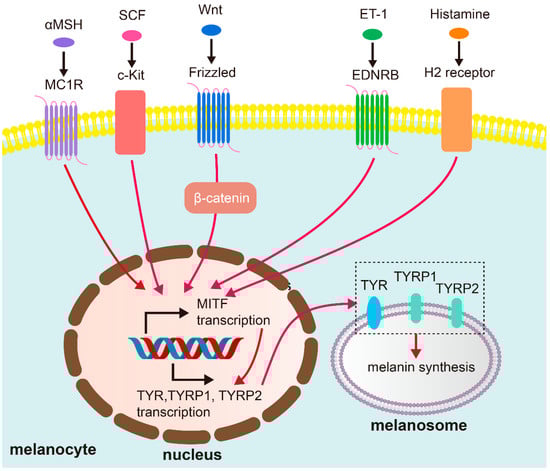 The regulatory process of melanin production is complex and is dominated by numerous signaling networks that coordinate the activity of melanocytes and their interactions with surrounding cells. Factors such as α-melanocyte stimulating hormone (αMSH), SCF, KGF, and bFGF secreted by these cells bind to the receptor and eventually converge into the microphthalmia-associated transcription factor (MITF) (Figure 1), which transcribes the key enzymes that regulate melanin production–tyrosinase (TYR), tyrosinase-related protein 1 (TYRP1), and TYRP2 []. The core pathways regulating MITF include αMSH/melanocortin 1 receptor (MC1R), Wnt/β-catenin, PI3K/Akt, cAMP/PKA, and SCF/c-kit mediated signaling pathways []. Among them, when α-MSH binds to MC1R, it activates adenylate cyclase (AC), promotes cyclic adenosine phosphate (cAMP) production, and then activates protein kinase A (PKA). PKA phosphorylates the transcription factor CREB, thereby stimulating transcription of MITF []. The Wnt/β-catenin pathway, transduced by frizzled receptor, for instance, is crucial for melanocyte development and proliferation, and its dysregulation can lead to altered melanogenesis. Similarly, the PI3K/Akt pathway plays a significant role in cell survival, proliferation, and differentiation, including that of melanocytes, and its aberrant activation can contribute to hyperpigmentation. The cAMP/PKA pathway is a classic pathway that regulates melanin synthesis. Elevated cAMP levels usually enhance the activity of tyrosinase, the rate-limiting enzyme of melanin synthesis. Furthermore, the SCF/c-kit signaling pathway is particularly critical in the epidermal–dermal crosstalk. SCF, secreted by dermal fibroblasts and others, bind to c-kit receptors on the surface of melanocytes, stimulating their proliferation, migration, and melanogenic activity [,].