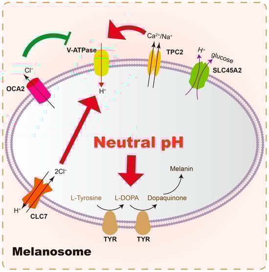 Melanosomes are specialized organelles within melanocytes where melanin synthesis and storage occur. The internal environment of melanosomes, particularly their pH, is crucial for optimal tyrosinase activity. The near-neutral pH (~6.8) of the mature melanosome is thought to provide a favorable environment for TYR []. The dynamic maintenance of pH in melanosomes is believed to be controlled by several membrane proteins. Briefly, the central melanosomal anion channel mediated by OCA2 expression transports Cl− into the cytoplasm to make the melanosome membrane voltage more negative, thereby decreasing V-ATPase-mediated H+ transport and luminal acidity, which enhances the activity tyrosinase and melanin production []; TPC2 mediated Ca2+/Na+ efflux, along with CLC7/OCA2 mediated H+ and Cl− flux, regulates the activity of V-ATPase to maintain luminal ionic homeostasis and pH []. (Summary in Table 2). OCA2 and SLC45A2 are presumed to be positive pH regulators, while V-ATPase and TPC2 are considered to be negative pH regulators (Figure 2). Strategies aimed at melanosome acidification would likely involve skin whitening by inhibiting tyrosinase activity [,].