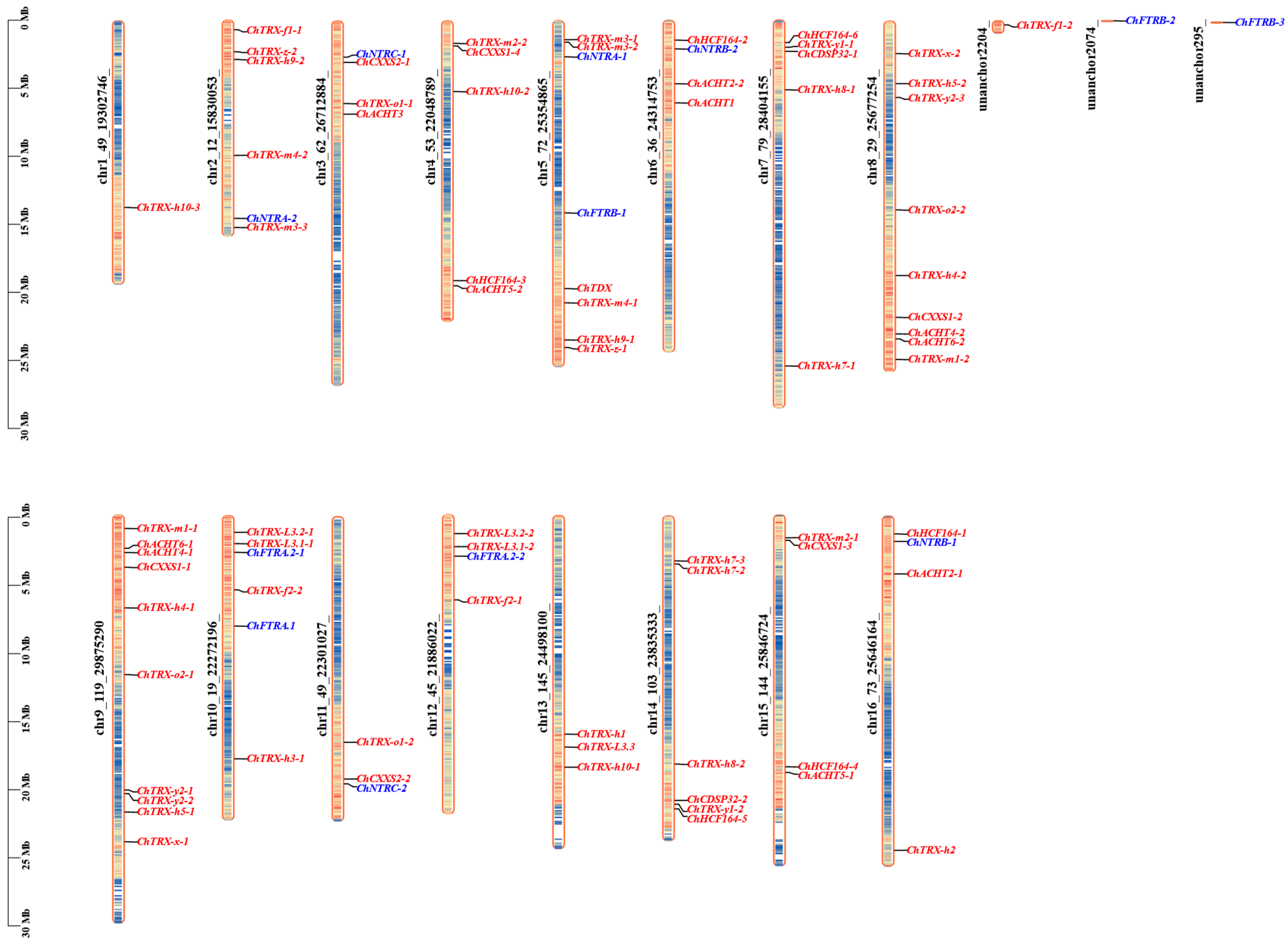 Figure 3. Chromosomal localization of the ChTRX and ChTR gene families. ChTRXs are marked in red, and ChTRs are marked in blue.