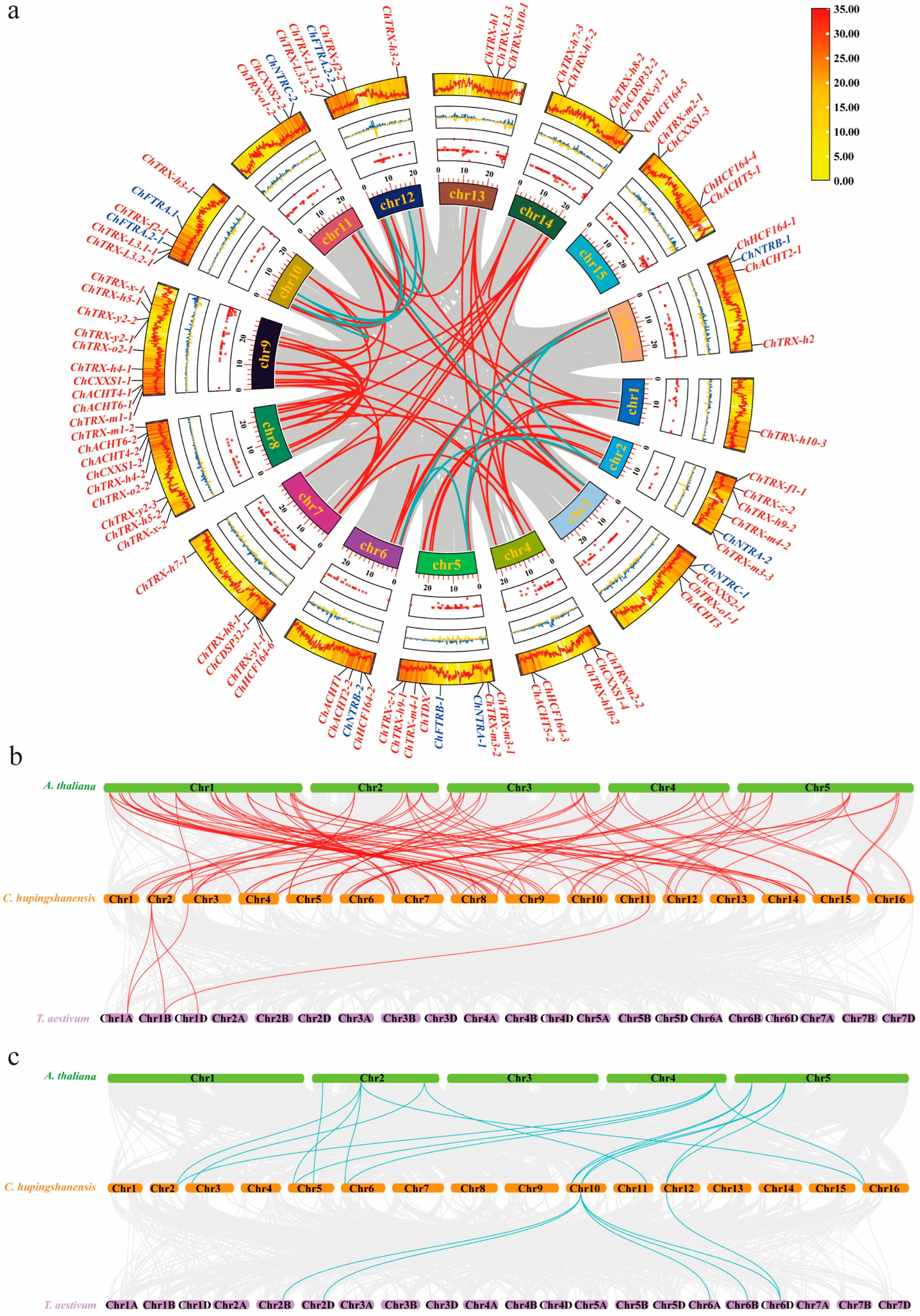 Figure 5. Synteny and Evolutionary Analysis of ChTRX and ChTR Gene Families. (a) Intra-genomic collinearity map of ChTRXs and ChTRs. In the Circos plot, progressing from inner to outer rings, the grey lines in the background represent collinear regions within the C. hupingshanensis genome. In contrast, the red lines highlight collinear gene pairs specifically within the ChTRXs and ChTRs. The figure also includes a dot plot showing N ratio distribution, a line plot of GC skew, a heatmap of gene density distribution, and a line plot depicting GC content variation. The labels indicate gene families, with ChTRXs marked in red and ChTRs in blue. (b,c) Synteny analysis of TRX and TR genes among C. hupingshanensis, A. thaliana, and T. aestivum. Red and cyan lines represent collinear pairs of TRX and TR genes, respectively, while grey lines denote all syntenic blocks within the genomes.